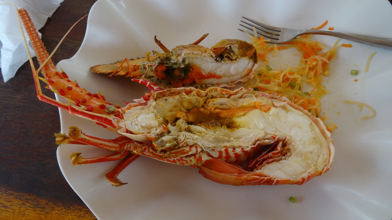 Journée ponctuée par un repas fruit de mer assez grandiose : Langouste / Popinée / Poisson grillé / riz au lait de Coco / salade de Papaye
